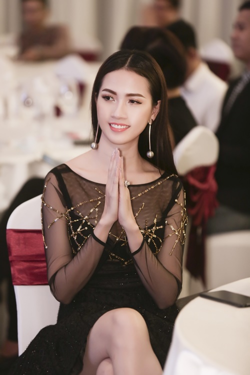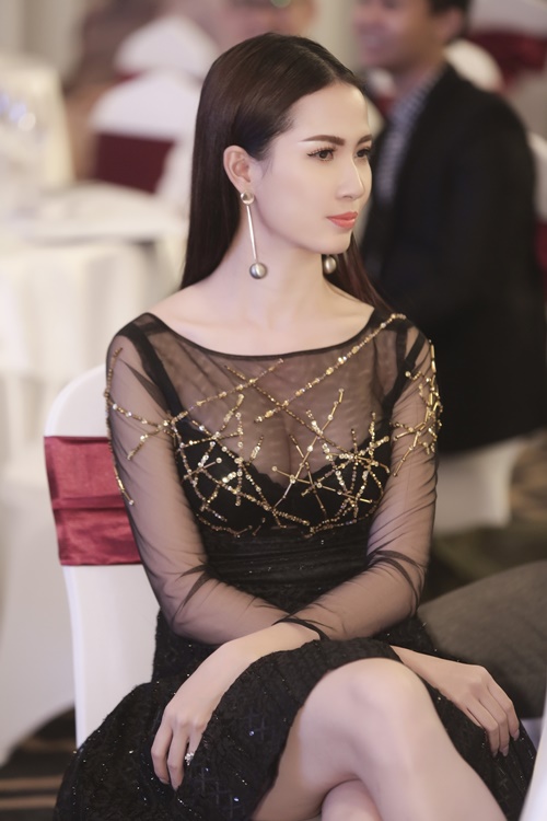 Chọn cho mình chiếc đầm đen xuyên thấu cùng với điểm nhấn là những đường nhũ màu vàng bắt mắt, người đẹp sinh năm 1990 tươi rói tại sự kiện.