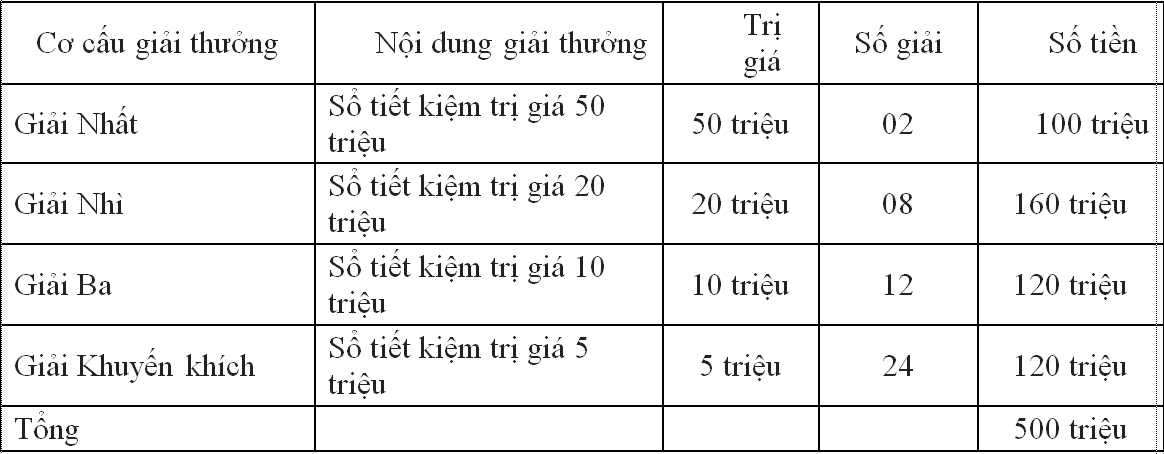 Theo đó, khi tham gia mở tài khoản tại Agribank và đăng ký dịch vụ Thẻ và một trong các dịch vụ Mobile Banking (SMS Banking, Agribank E – Mobile Banking, BankPlus) của Agribank, khách hàng được nhận mã số dự thưởng (chính là mã khách hàng) để tham gia qua số dự thưởng Chương trình với tổng giá trị giải thưởng lên tới 500 triệu đồng. Cơ cấu giải thưởng như sau:
