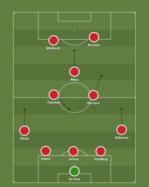 Cũng với sơ đồ 3-5-2 hoặc biến hóa thành 5-3-2 của ĐT Hà Lan ở World Cup, HLV Van Gaal bố trí Shaw và Antonio Valencia trong vai trò các cầu thủ chạy cánh vừa lo nhiệm vụ phòng ngự cho bộ ba trung vệ đồng thời hỗ trợ tấn công biên.