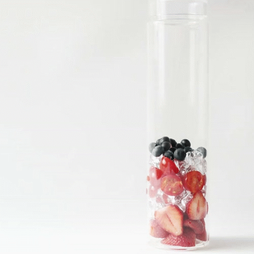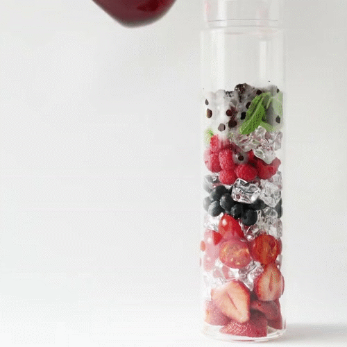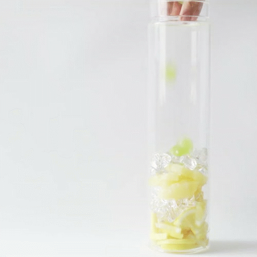 Xếp hoa quả đã cắt xen kẽ với đá thành từng lớp vào trong chai.