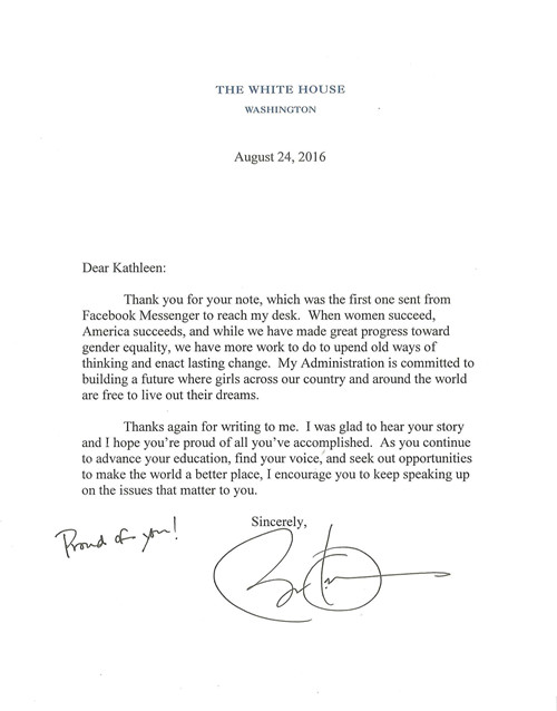 Cám ơn lá thư của bạn, và đây cũng là tin nhắn Facebook đầu tiên để trên bàn tôi. Sự thành công của phụ nữ cũng chính là sự thành công của nước Mỹ, và khi chúng ta gặt hái được những bước tiến to lớn về bình đẳng giới, chúng ta có thể xóa bỏ bớt những định kiến cũ kỹ, thực hiện những thay đổi bền vững. Trong nhiệm kỳ của mình, tôi mong muốn xây dựng một tương lai, nơi những phụ nữ ở đất nước chúng ta và cả trên thế giới được tự do theo đuổi giấc mơ của họ.