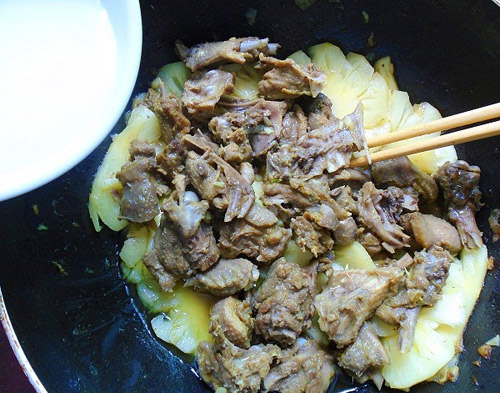 Bước 4: Khi thịt vịt chín mềm cho ra đĩa, vẫn chảo đó cho dứa vào xào đến khi dứa tiết ra vị chua, mềm sau đó cho thịt vịt vào xào cùng, nêm nếm gia vị cho vừa miệng.