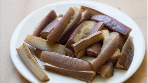 - Cà tím rửa sạch, cắt miếng theo chiều dọc, sau đó bạn ngâm nước muối loãng để cà không thâm