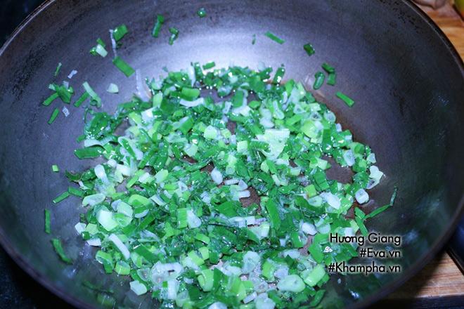 - Bước 4: Cho một ít dầu ăn vào chảo, đun nóng, cho hành lá đã thái nhỏ vào, đảo đều rồi tắt bếp.