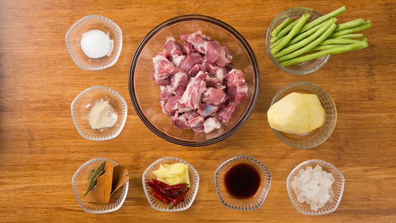 - Sau đó, vặn nhỏ lửa, thêm gừng, đậu đũa, khoai tây, dầu hào, muối, ớt khô, quế, lá nguyệt quế, tiêu vào nồi. Đảo đều 1 phút.