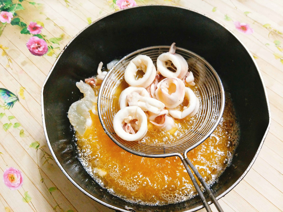 Tiếp theo bạn đặt chảo lên bếp cho nhiều dầu để chiên, đun cho nồi dầu nóng thì gắp từng miếng mực cho vào chiên tới khi mực chín là vớt ra, để ráo dầu.