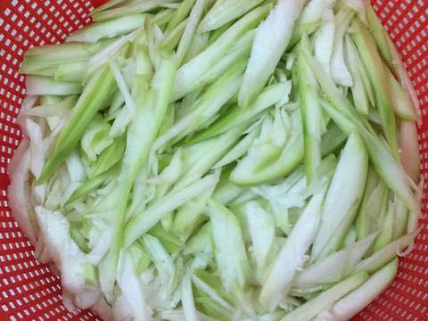 - Bầu đem gọt sơ vỏ bên ngoài, rửa sạch, thái thành từng sợi nhỏ để riêng ra. Hành tím đem bóc vỏ, rửa sạch, đập dập ra. Hành lá nhặt sơ, rửa kĩ với nước, thái nhỏ ra.