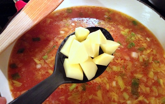 - Bước 3: Cho nước dùng và sốt cà chua vào nồi. Đậy vung lại đun sôi canh, sau đó cho nhỏ lửa và đun trong 15-20 phút tới khi rau đã chín một nửa.