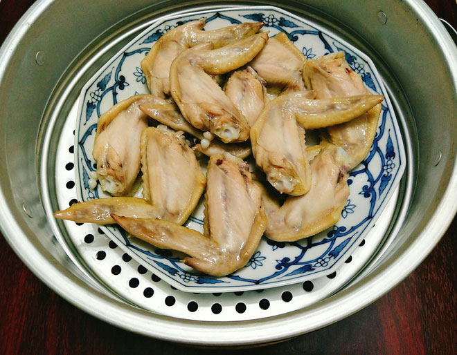 - Bước 4: Cánh gà sau khi đã ướp gia vị thì cho vào đĩa, đặt trong xửng hấp khoảng 7 phút cho cánh gà gần chín là được, hoặc bạn cũng có thể quay 5 phút trong lò vi sóng.