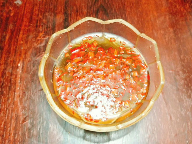 - Bước 7: Cho nước mắm, đường vào bát con, chanh vắt lấy nước cốt cho vào cùng, thêm ớt băm, 1/4 bát con nước và khuấy đều cho hòa tan.