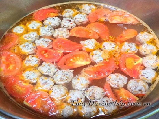 Bước 4: Cà chua chín nhừ thì chế vào 1 lít nước và nấu cho sôi. Khi nước sôi ta cho từng viên mọc thịt vào, thêm 2 thìa cà phê hạt nêm cùng mì chính (nếu thích), 2 thìa nước mắm và nấu đến khi những viên mọc nổi lên là được.