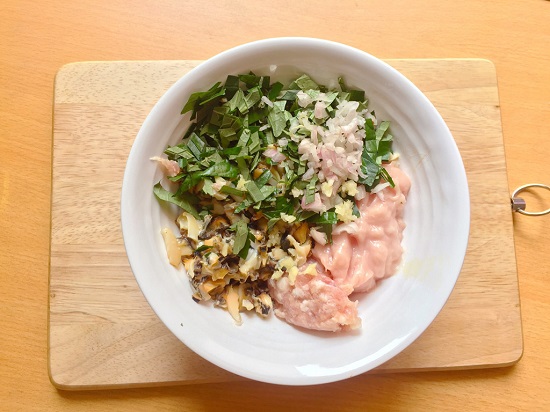 - Bước 2: Tiếp đến bạn trộn tất cả nguyên liệu đã chuẩn bị sẵn với giò sống. Bạn không cần nêm mắm muối vì giò sống đã mặn vừa đủ, cho thêm một chút hạt tiêu giúp chả thơm hơn.