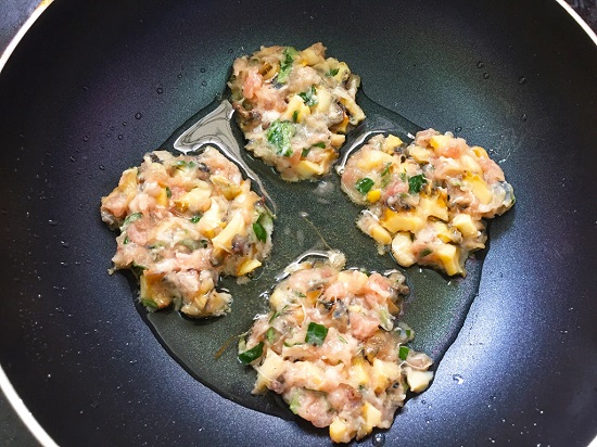 - Bước 3: Sau đó, bạn cho vào chảo một lượng dầu ăn để sôi và thả từng miếng chả ốc vào rán.