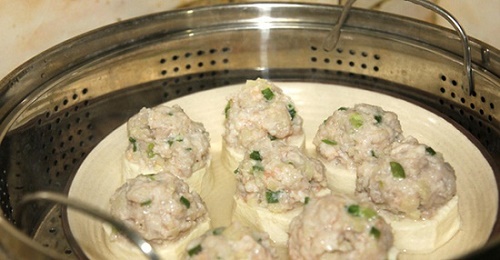 - Bước 4: Đậu phụ cắt miếng vuông hoặc tròn khoảng 5 cm. Vê viên hỗn hợp tôm thịt rồi đặt lên miếng đậu. Cho vào nồi hấp khoảng 15 phút để đậu chín.