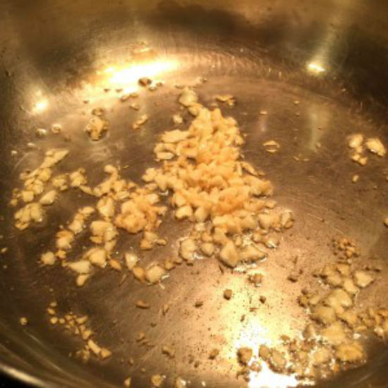 - Bước 1: Cho dầu vào chảo, đợi dầu nóng thì cho tỏi băm vào, phi tỏi đến thơm vàng.