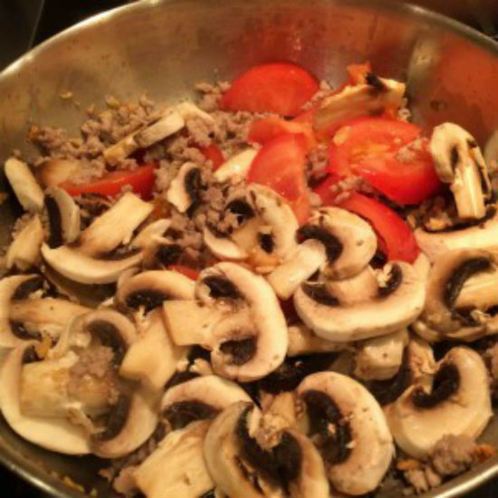 - Bước 3: Xào tới khi thịt băm được đảo đều và gần chuyển màu thịt chín thì cho nấm và cà chua vào, đảo đều.