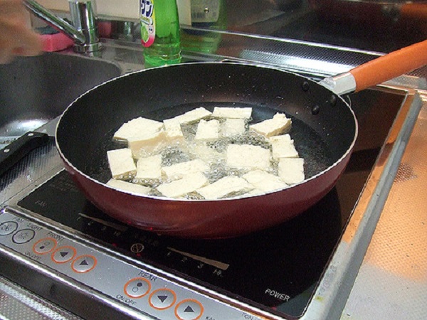 - Bước 1: Bắc chảo lên bếp, làm nóng chảo với lượng dầu vừa phải. Khi dầu bắt đầu sôi, thả từng miếng đậu vào chiên cho đến khi vàng đều khắp mặt.