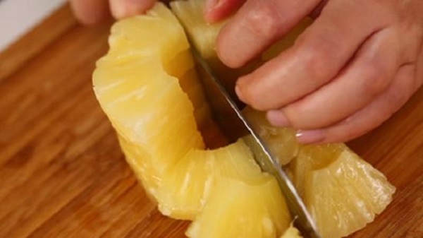 - Dứa gọt vỏ, bỏ mắt và rửa sơ qua, cắt miếng tam giác dày chừng 1cm. Sau đó bạn thả phần dứa vừa thái vào bát nước muối loãng chừng 10 phút, rồi vớt ra cho ráo.