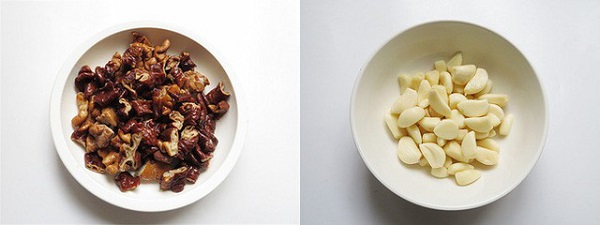 - Bước 2: Lòng già sơ chế sạch rồi luộc chín sau đó thái miếng vừa ăn. Tỏi bóc bỏ vỏ.