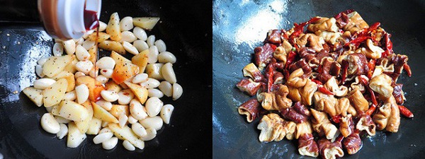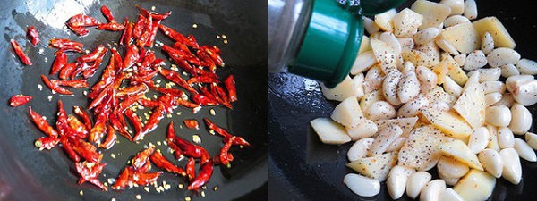 - Bước 3: Đun nóng một chút dầu ăn trong chảo, cho ớt và gừng vào xào thơm rồi trút ra bát. Cho tỏi vào xào khoảng 6 phút để tỏi chín rồi cho khoai tây cùng hạt tiêu vào xào thêm khoảng 2 phút.