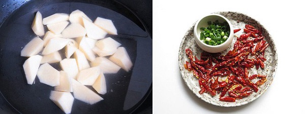 - Bước 1: Khoai tây gọt vỏ rửa sạch rồi thái khối. Cho khoai tây vào nồi nước luộc qua khoai tây rồi vớt ra để ráo nước. Ớt khô cắt khúc, hành lá thái nhỏ.
