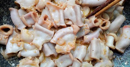 - Bước 1: Trước tiên bạn lấy 1 mẩu gừng cho vào đầu lòng non để lọt vào trong, vuốt cho miếng gừng chạy dọc từ đầu này qua đầu kia, làm như vậy 2 lần rồi bóp lòng với 1 chút giấm, muối sau đó rửa lại cho sạch.