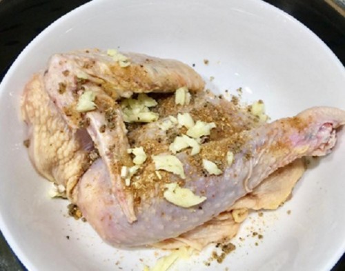 + Thoa đều hỗn hợp trên lên gà. Ướp chừng 10 phút.