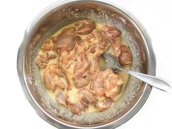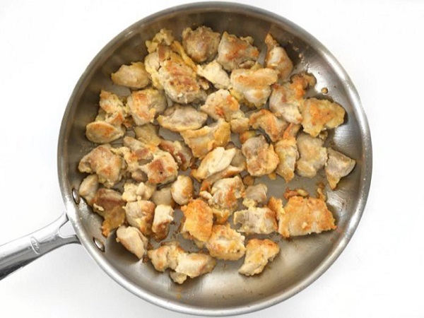 - Bước 3: Trút thịt gà vào âu trứng, đảo đều cho hỗn hợp trứng phủ đều từng miếng gà. Làm nóng 2 muỗng canh dầu ăn trong chảo sau đó cho gà vào chiên đến khi chín vàng đều.