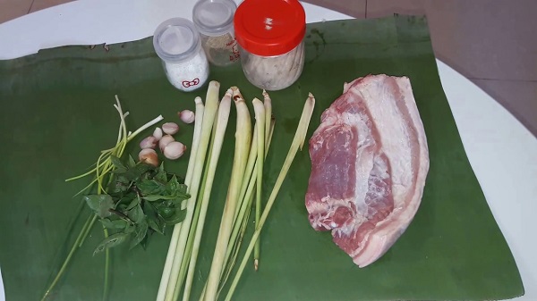- Xếp sả, gừng, ớt vào khai hấp, tiếp đó cho thịt heo rừng đã ướp lên trên và cuối cùng cho thêm hành lá, gừng xắt sợi lên mặt. Hấp khoảng 20 phút là thịt chín.