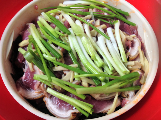 Từng miếng thịt heo hấp hành gừng trắng ngần, phần da ngoài giòn giòn và đặc biệt là hương bị thơm ngon vô cùng.
