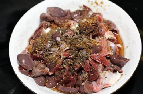 - Bước 2: Thái lòng gà thành những miếng nhỏ. Ướp cùng một chút hạt tiêu, hạt nêm, gia vị.