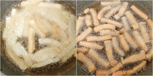 - Đậu hũ cắt sợi vừa rồi chiên vàng đều.