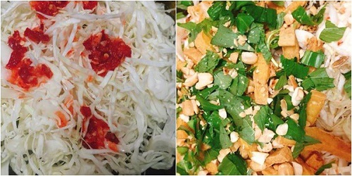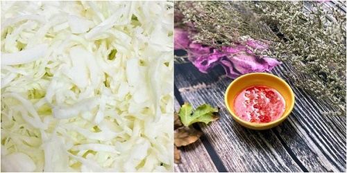 - Bắp cải bào mỏng, rửa sạch, ngâm muối loãng rồi rửa lại cho sạch sẽ.