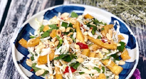 Lấy bắp cải ra tô, cho mắm chay vào, sau đó cho đậu hũ, rau mùi, đậu phộng giã dập vào, trộn đều nếm sao cho đủ vị chua ngọt, đậm vừa.