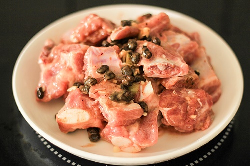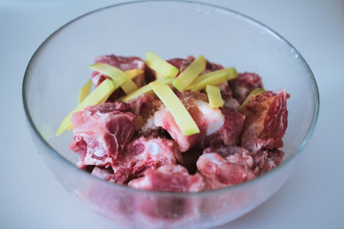 - Bước 1: Xương sườn rửa sạch nhiều lần dưới nước rồi vớt ra để ráo, cho gừng thái lát mỏng, 1 thìa rượu gạo, 2 thìa đường, 1 nhúm muối sau đó ướp trong tủ lạnh từ 3-4 tiếng.