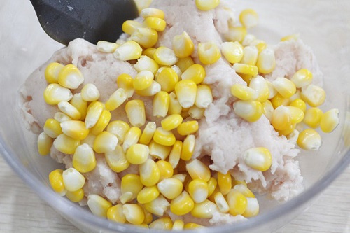 - Bước 3: Thịt gà sau khi xay thì đổ ra bát, thêm ngô vào trộn đều. Cho hỗn hợp thịt gà vào túi bắt kem.