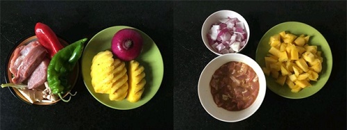 - Bước 1: Thịt thái miếng vừa ăn, ướp với 15ml nước tương, 1 lòng trắng trứng và 10g bột năng trong 10 phút. Dứa thái khối nhỏ, hành tây thái miếng vuông nhỏ.