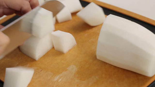 - Nạo vỏ củ cải, rửa lại với nước để đảm bảo loại bỏ hết các bụi bẩn còn sót, bổ miếng vừa ăn.