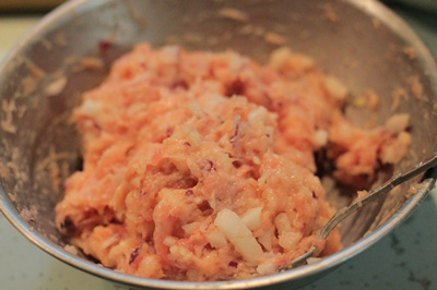 - Thịt nạc băm đổ ra bát, trộn vào một thìa nhỏ muối, hai thìa nhỏ nước mắm, hạt tiêu, hành khô thái nhỏ, dùng thìa quết nhuyễn.