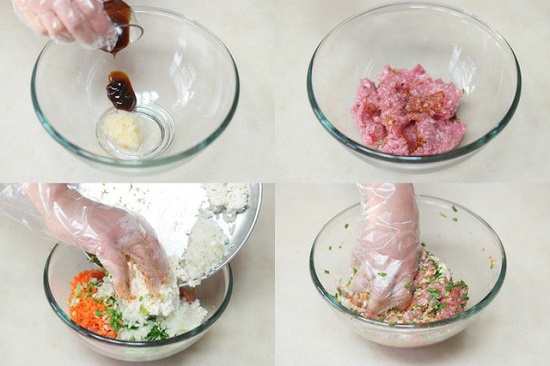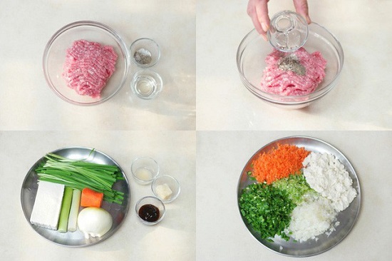 - Bước 1: Cho thịt băm vào bát sau đó thêm chút muối, hạt tiêu và rượu gừng vào trộn đều. Đậu phụ nghiền nát; hẹ, gốc hành, hành tây, cà rốt đều thái thật nhỏ.