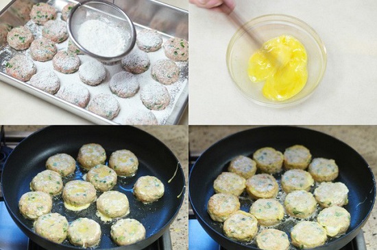 - Bước 4: Rây tiếp một lớp bột mì lên trên thịt viên. Đập trứng vào bát, đánh tan trứng. Nhúng thịt viên qua trứng sau đó cho vào chảo dầu đã đun nóng, chiên chín vàng đều hai mặt là được.