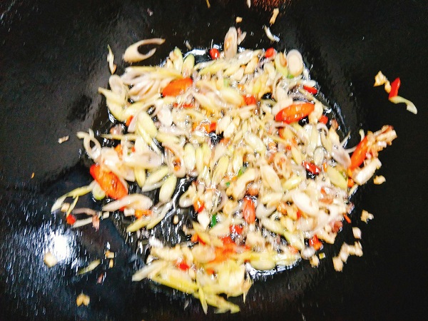 - Bước 2: Sau 30 phút bạn đặt chảo lên bếp cùng với 2 thìa dầu ăn đun cho dầu nóng, tiếp theo cho tỏi và hành khô băm nhỏ và phi cho thơm rồi cho sả, ớt vào xào cùng cho dậy mùi thơm.