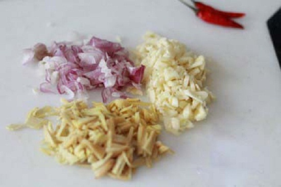 - Băm nhỏ tỏi + hành. Thái gừng thành sợi nhỏ.