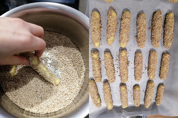 - Bước 5: Xoa từng thanh bột thành trụ tròn. Xịt một lớp nước lên bề mặt thanh bột rồi lăn qua vừng trắng.