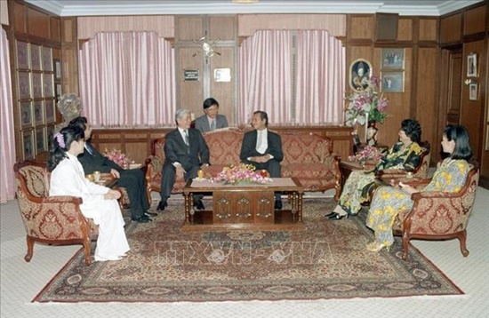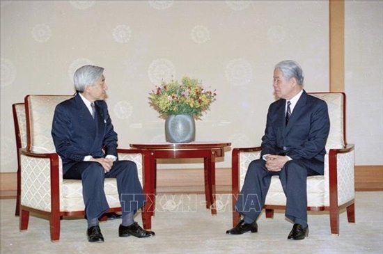| Tổng Bí thư Đỗ Mười hội kiến Nhà vua Nhật Bản Akihito tại Hoàng Cung ở thủ đô Tokyo, ngày 19/4/1995. Ảnh: Xuân Lâm/TTXVN |