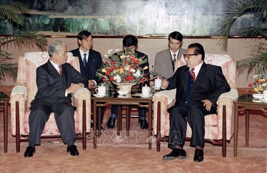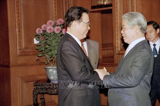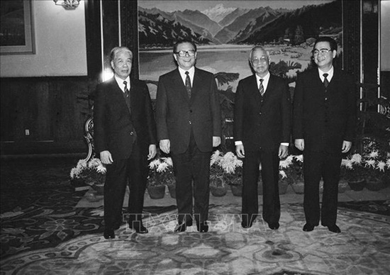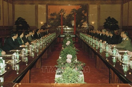 | Chủ tịch Trung Quốc Dương Thượng Côn (bên phải) tiếp Đoàn đại biểu cấp cao Đảng, Nhà nước Việt Nam, do Tổng Bí thư Đỗ Mười và Chủ tịch Hội đồng Bộ trưởng Võ Văn Kiệt dẫn đầu, sang thăm Trung Quốc (tháng 11/1991). Tại chuyến thăm này, hai nước tuyên bố 'khép lại quá khứ, mở ra tương lai', thực hiện bình thường hóa quan hệ giữa hai Đảng và hai Nhà nước. Ảnh: Xuân Lâm/TTXVN |