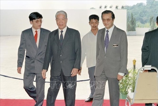 | Thủ tướng Malaysia Mahathir bin Mohamad và gia đình tiếp thân mật Tổng Bí thư Đỗ Mười thăm chính thức Malaysia (3/1994). Ảnh: Xuân Lâm/TTXVN |