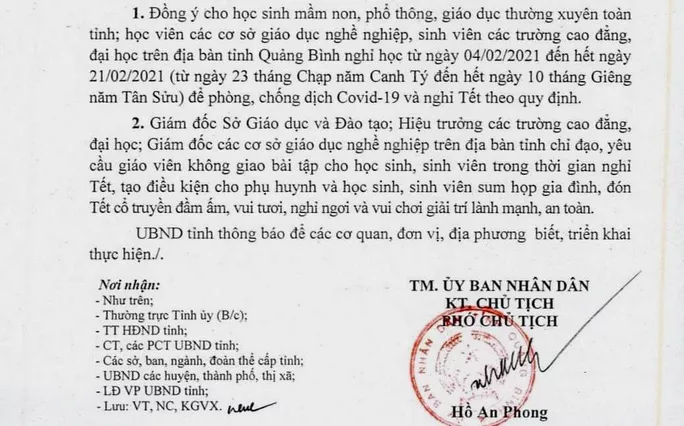 Đáng chú ý, ông Hồ An Phong, Phó Chủ tịch UBND tỉnh Quảng Bình yêu cầu Giám đốc sở GD&ĐT, Hiệu trưởng các trường chỉ đạo giáo viên không giao bài tập cho học sinh, sinh viên trong thời gian nghỉ Tết.