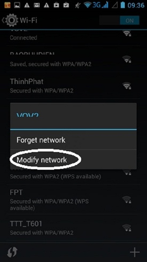 Trong danh sách các mạng Wi-Fi, bạn hãy ấn giữ ngón tay trên mạng Wi-Fi nào bạn đang dùng cho đến xuất hiện 2 lựa chọn. Hãy chọn Modify network (Sửa đổi mạng). Bấm vào lựa chọn Show advanced options (Hiển thị tùy chọn nâng cao) phía dưới. Sẽ có thêm mục nhỏ IP settings (Cài đặt IP), chọn Static (Tĩnh) trong danh sách xổ ra. Kéo màn hình xuống dưới cùng rồi điền vào DNS 1 là 8.8.8.8 và DNS 2 là 8.8.4.4. Nhập xong ấn Save (Lưu).