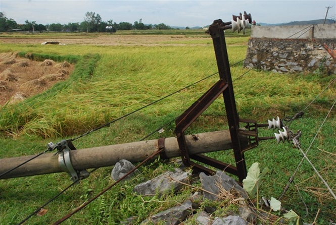 Cột điện cao thế bị gãy tận gốc. Ảnh: Báo Nông nghiệp Việt Nam. |